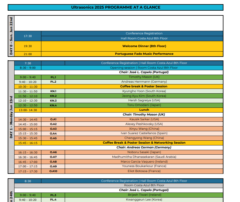 7th International Caparica Conference on Ultrasonic-based applications from analysis to synthesis 22nd – 26th June 2025 | Caparica | Portugal Schedule Conference starts with a welcome dinner at 7:30 PM on Sunday. Opening Session: Monday, 8:30 AM. Closing Session: Thursday, 12:45 AM. The schedule is subject to change without notice.
